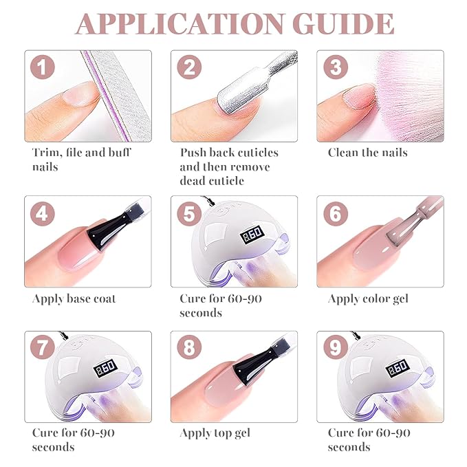 - SALON QUALITY HOME USED:Nude misty pink gel nail polish is good choice for a nail salon or nail starter at home.You can design your own manicure at home to show your style. Remember the gel polish needs to be cured under nail l a m p. Average for Nail Lamp 60-120 secs