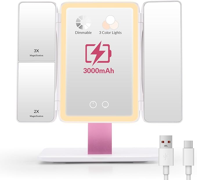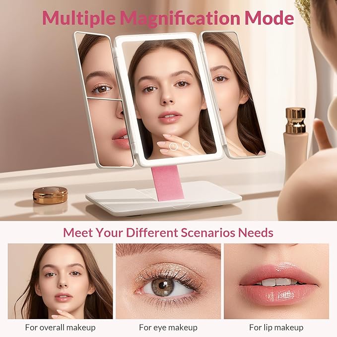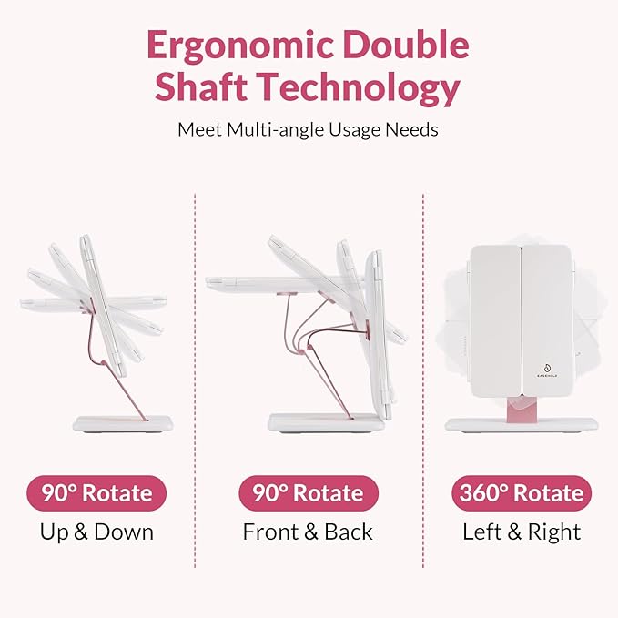 - 【Tri-Fold Design & Flexible Rotation】Our trifold makeup mirror features 360° swivel and 90° multi-angle rotation (up/down, front/back), letting you adjust to any beauty angle with ease. Foldable design saves space—perfect for countertop use at home or portable travel. A must-have vanity mirror for daily makeup, skincare, or on-the-go touch-ups.
