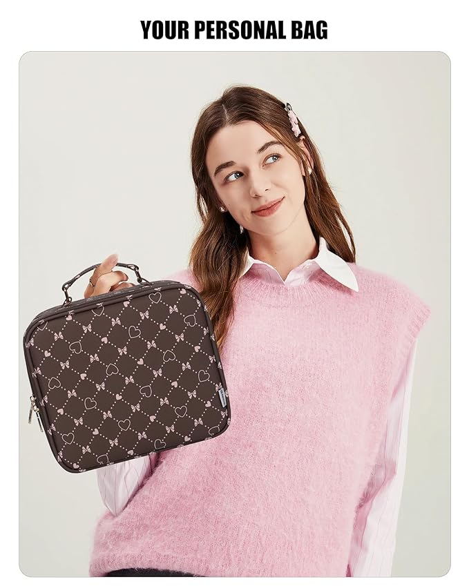 Relavel Travel Makeup Bag With LED Mirror, Portable Cosmetic Organizer Bag with Adjustable Brightness in 3 Color Scenarios, Small Train Case with Detachable Dividers for Trip- Brown Bowknot