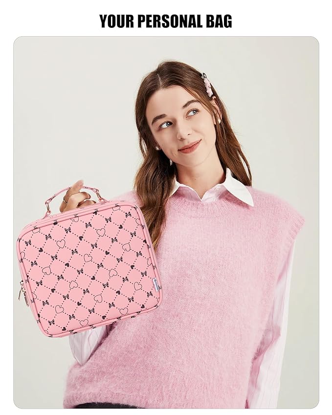 Relavel Travel Makeup Bag With LED Mirror, Compact Cosmetic Organizer Storage with Brush Compartment, 3 Colors in Adjustable Brightness, Adjustable Dividers, Make Up Train Case - Pink Bowknot