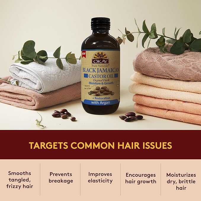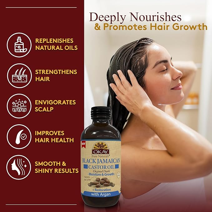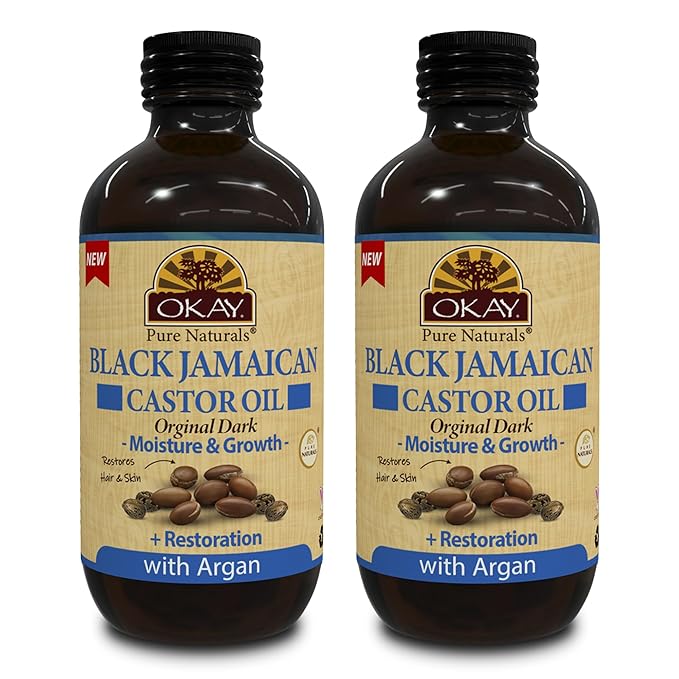 Okay Pure Naturals Black Jamaican Castor Oil with Argan Oil - Castor Oil for Hair Growth, Moisture for Skin, Face, Scalp, Eyelashes, Eyebrows, for Men & Women - 4 Fl Oz Glass Bottle (2 Pack)