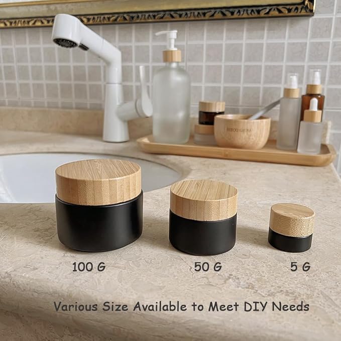 - 【VERY PRACTICAL COSMETIC CONTAINERS JAR】The empty bamboo frosted black jar made by glass and natural bamboo lid.Capacity:30ml/1oz. The set comes with a set of 4 pcs 50g cream jar for cosmetic storage,The material is of luxury glass with wide mouth for better storage for facial cream, mud mask, hand cream, body butter, blusher,body scrub,essential cream and other skin care products,perfect for cosmetic items DIY making and packing.