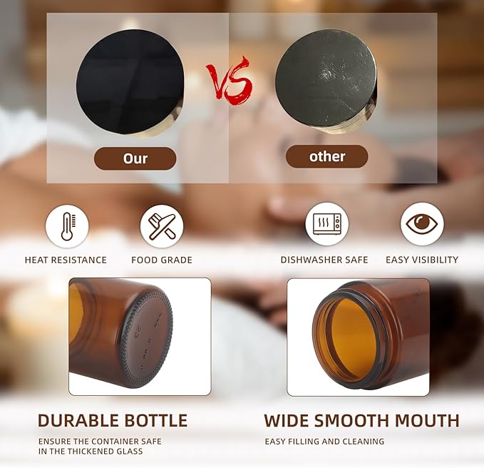- 2.Amber Color for UV Protection: The amber hue not only adds elegance to your collection but also serves to protect your contents from harmful UV rays, helping to extend the freshness and potency of your products. These 4 oz and 2 oz amber glass jars with lids are perfect for skincare and cosmetics that require gentle preservation