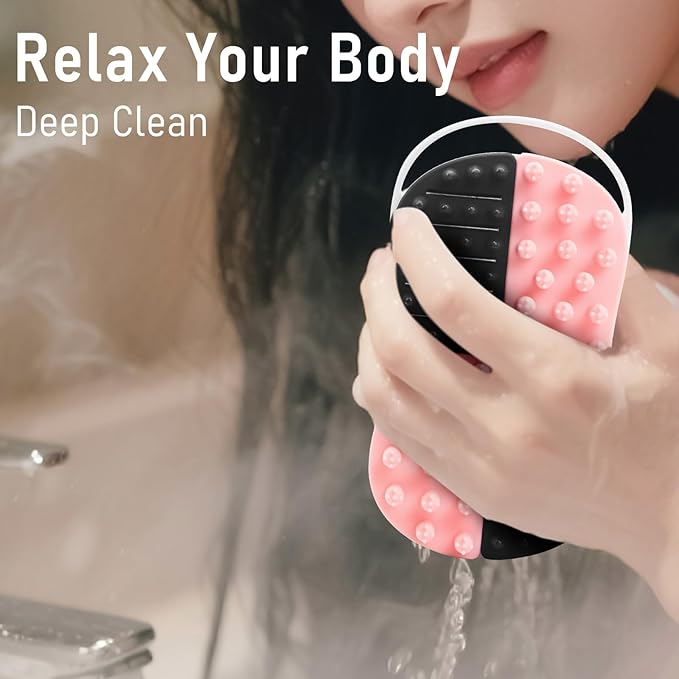 2 in 1 Silicone Body Hair Scrubber Upgraded Bristles Exfoliator Massage Shower Bathing Bath Women Brush Scrubbers for All Skin Body Wash (1pc Black + Pink)