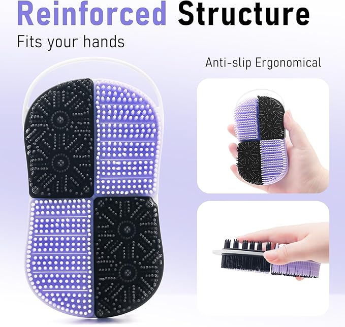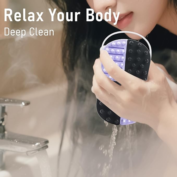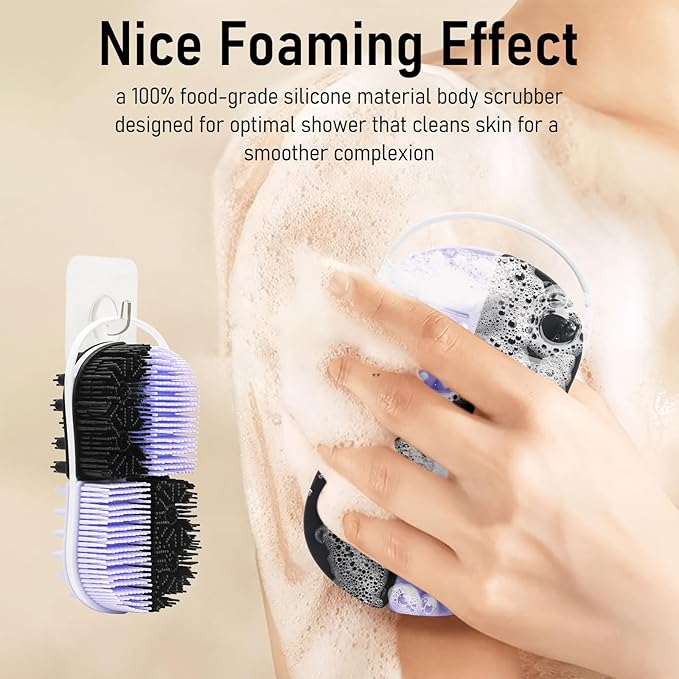 2 in 1 Silicone Body Hair Scrubber Upgraded Bristles Exfoliator Massage Shower Bathing Bath Women Brush Scrubbers for All Skin Body Wash (1pc Black+Purple)