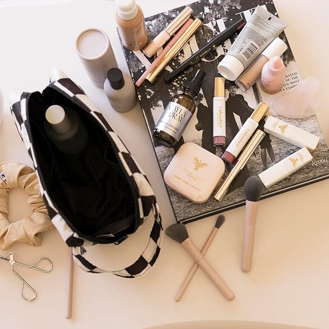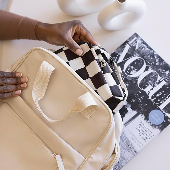 Tiny Twinkle Portable Waterproof Makeup Bag | Travel-Friendly Cosmetic Organizer with Convenient Carry Handle | Spacious Interior, and Secure Zipper Closure (Black Checkers)