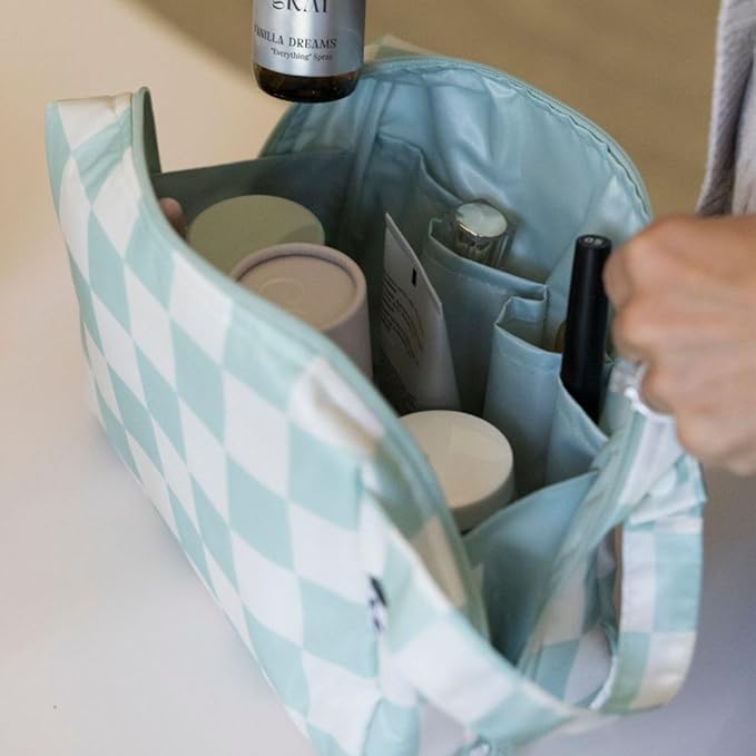 Tiny Twinkle Portable Waterproof Makeup Bag | Travel-Friendly Cosmetic Organizer with Convenient Carry Handle | Spacious Interior, and Secure Zipper Closure (Sage Checkers)