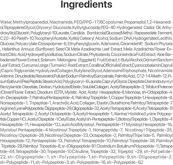 - [KEY INGREDIENTS] Powered by NAD+, an anti-aging ingredient that boosts cell turnover, stimulates collagen production, and supports repair, along with 50 peptides to visibly firm and plump the skin. *The formula’s soft violet hue comes from Vitamin B12, while its natural pearlescence is derived from ceramides. Formulated with 1,000ppm of 100% pure salmon PDRN to restore a natural glow and even skin tone by strengthening the skin barrier and supporting overall skin health.