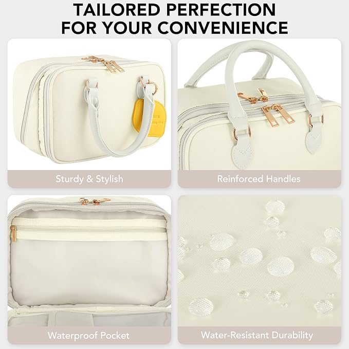 Travel Makeup Bag for Women Fashion Large Capacity Pouch Open Flat Cosmetic Portable Organizer Waterproof Large Opening Storage Toiletry Bags Vertical Free-Standing Brush Holder for Easy Access Beige