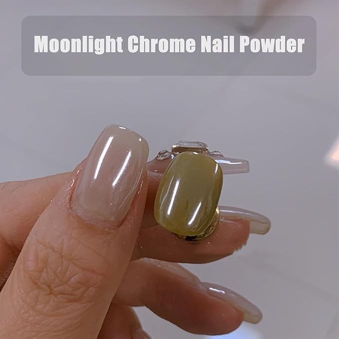 - Package Contents: 2 Jar Nail Powder and 2 Eyeshadow stick. Clear White Moonlight Nail Chrome Powder. It will not cover the original color of the nail gel polish, but can increase the gloss. It is recommended to choose a light color as the base color.