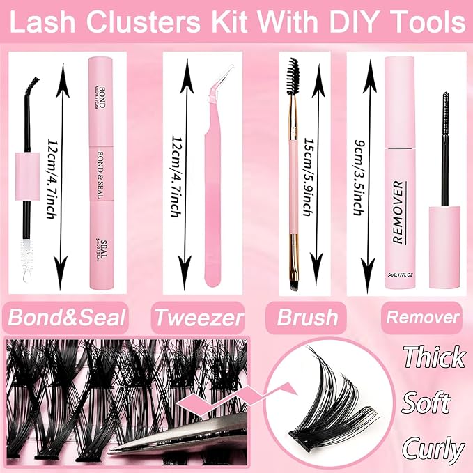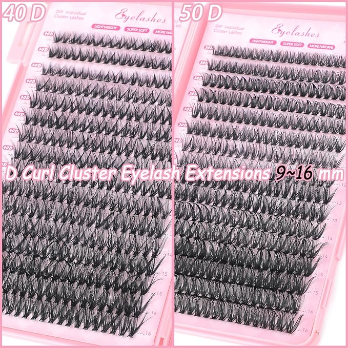 Lash Clusters Kit, 640 Pcs Eyelashes Clusters Extensions Kit 9-16mm Individual Lashes D Curl Fluffy Wispy False Eyelashes Thin Band, with Bond Seal Remover Tweezers Brush DIY (40D+50D Kit 9-16mm)
