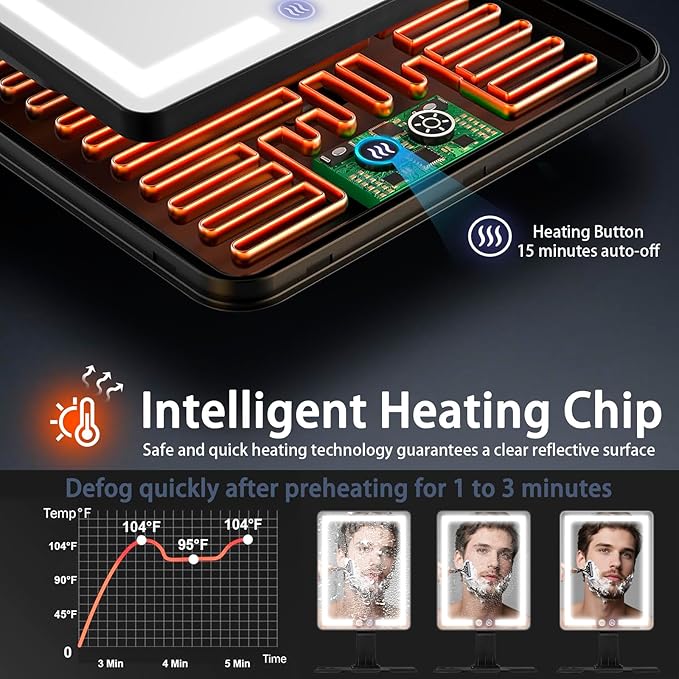- Heated Shower Shaving Mirror Fogless for Men & Energy-Efficient: The shower shaving mirror fogless for women & men adopts a self-heating anti-fog design with an upgraded heating chip built in. After the fogless shower mirror turns on the defog function, the blue indicator light turns on and it can heat to the preset temperature within 1-4 minutes. The smart chip will detect the ambient temperature. When the temperature is higher than 100.4°F (38℃), the anti fog shower mirror will automatically stop heating; when the temperature is lower than 89.6°F (32℃), the antifog mirror for shower will reheat to prevent fogging and improve your shaving experience.
