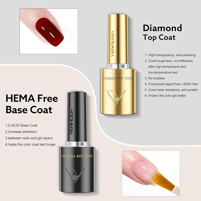 VENALISA 2 Pcs No Wipe Gel Top Coat and Base Coat Set- High Gloss Shiny Base Top Coat Gel Nail Polish Kit, Soak Off Nail Art Home and Professional Manicure