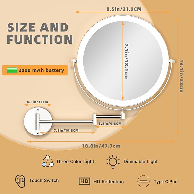 - 【Adjustable Extension Arm】①The extendable arm reaches up to 19.7 inches, allowing you to position the mirror at the perfect angle for your routine; ②360°free rotation allows you to effortlessly find your desired angle; ③When you're done, you can fold it back against the wall to save space. This versatility makes it ideal for any bathroom or vanity setup. The cosmetic mirror has passed over 20,000 times fatigue test, proved the durability and stability of the rotating shaft.