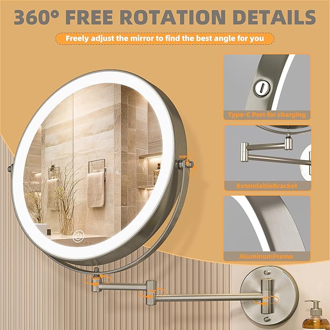 - 【Adjustable Extension Arm】①The extendable arm reaches up to 19.7 inches, allowing you to position the mirror at the perfect angle for your routine; ②360°free rotation allows you to effortlessly find your desired angle; ③When you're done, you can fold it back against the wall to save space. This versatility makes it ideal for any bathroom or vanity setup. The cosmetic mirror has passed over 20,000 times fatigue test, proved the durability and stability of the rotating shaft.