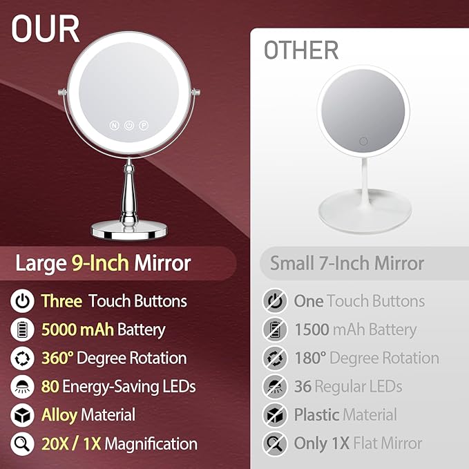 - 1X/20X Lighted Makeup Mirror: This 9-inch vanity mirror seamlessly combines a standard 1X mirror with a 20X magnification mirror, ideal for both daily makeup routines and precision grooming. The 20X mirror provides ultra-clear visibility for detailed tasks like eyebrow shaping, blackhead removal, and false lash application, while the built-in lighting enhances accuracy in any environment. Wonderful for women seeking professional-grade detail in their beauty regimen