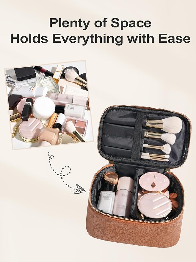 - 💕LARGE CAPACITY: With 4 elastic brush pockets on top are ideal for women’s brush, mascara, eyeliner, and has PVC cover to keep them clean. The main compartment can storage cosmetics and skincare with a adjustable padded divider. Also offer two internal pockets for special items.