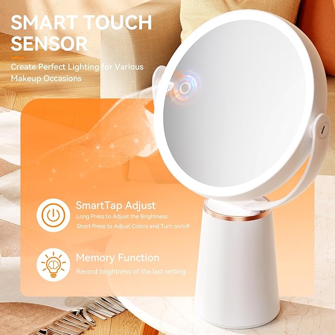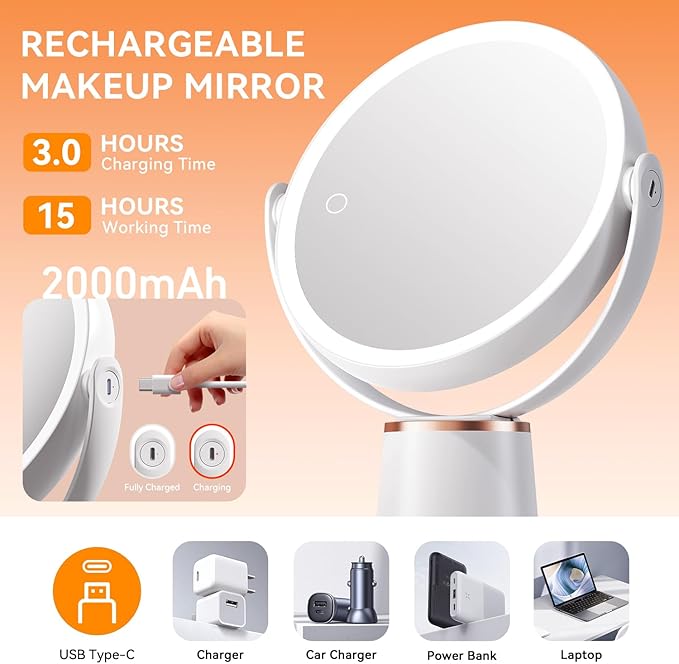Makeup Mirror with Lights, Double Sided 30X/1X Magnifying Mirror, 3 Color Stepless Dimmable Mirrors with Touch Screen, 2000 mAh Rechargeable 360ยฐ Free Standing Vanity Mirrors for Women