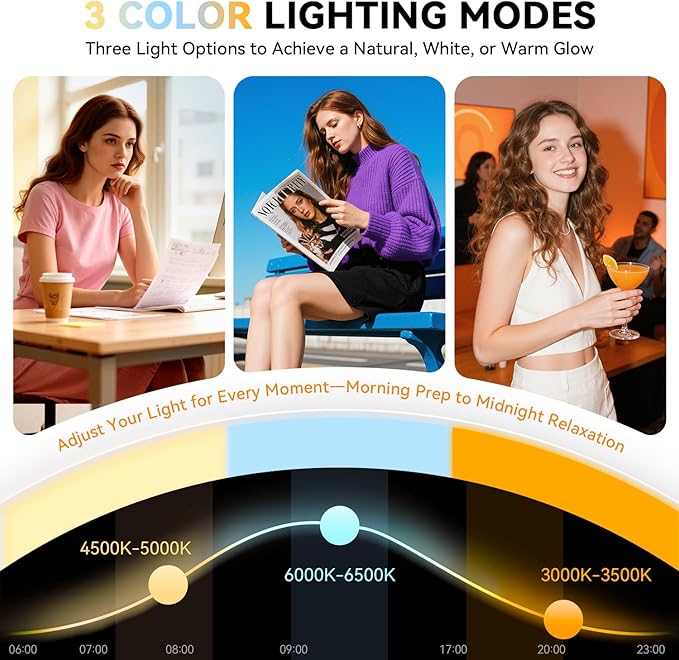 - ใ๐ฏ ๐๐ผ๐น๐ผ๐ฟ ๐๐ถ๐ด๐ต๐๐ถ๐ป๐ด & ๐๐ถ๐บ๐บ๐ฎ๐ฏ๐น๐ฒ ๐๐ฟ๐ถ๐ด๐ต๐๐ป๐ฒ๐๐ใThis makeup mirror features a total of 64 LED lights, offering 3 adjustable color temperatures: cool, natural, and warm light. Unlike other mirrors with only one switch, our innovative design features independent switches on both sidesโno more awkward reaching or flipping. Simply press the buttons to customize brightness levels and select your ideal color for any skincare or makeup needs.