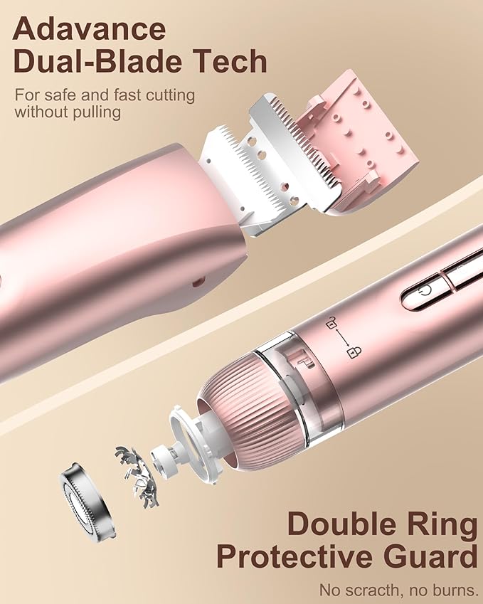 - 🔄【2-in-1 Precision Bikini Trimmer】: Say goodbye to multiple tools with our bikini trimmer for women – seamlessly switch between a wide trimmer for the bikini line and a precision head for facial hair. This all-in-one electric shaver for women is perfect for shaping, detailing, and removing unwanted hair from the underarms, face, legs, and intimate areas without nicking or irritation. Whether you're prepping for the beach or fine-tuning before a night out, enjoy salon-smooth skin from head to toe