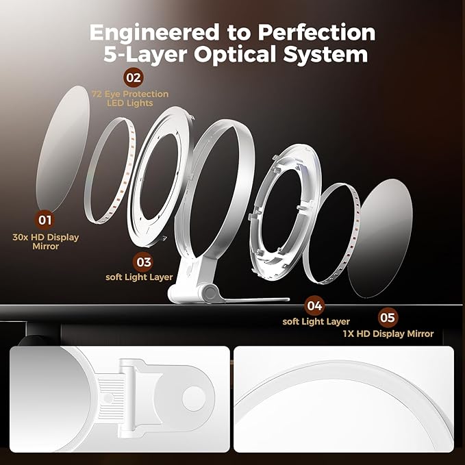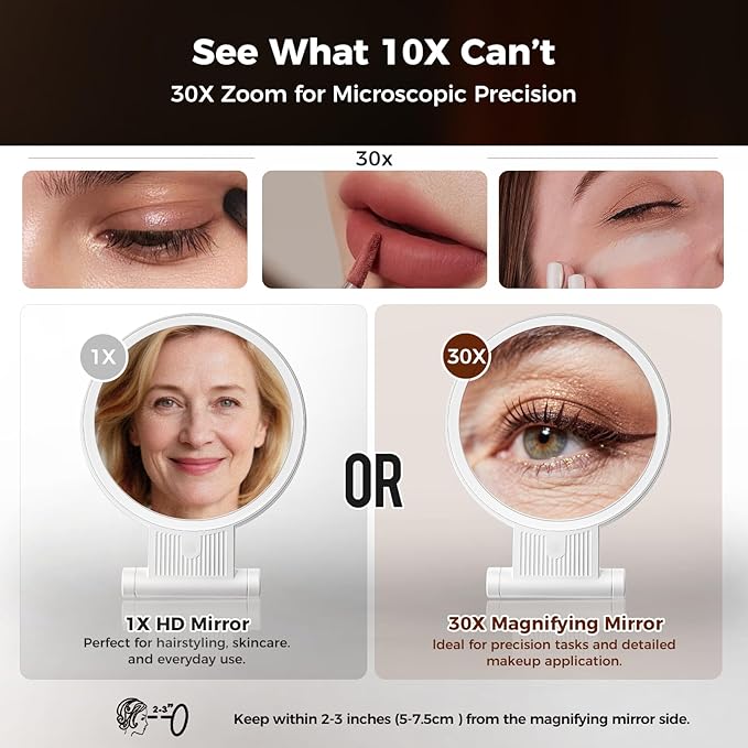 - 【1X/30X Double-Sided Mirror – See the Finest Details】This vanity mirror features 1X and ultra-strong 30X magnification for daily grooming and precision beauty needs. Use the 1X side for an overall view, and switch to 30X to perfect every detail—ideal for tweezing, eyeliner, or skin checkups. Tip: Keep your face within 4 inches when using 30X to avoid visual distortion.