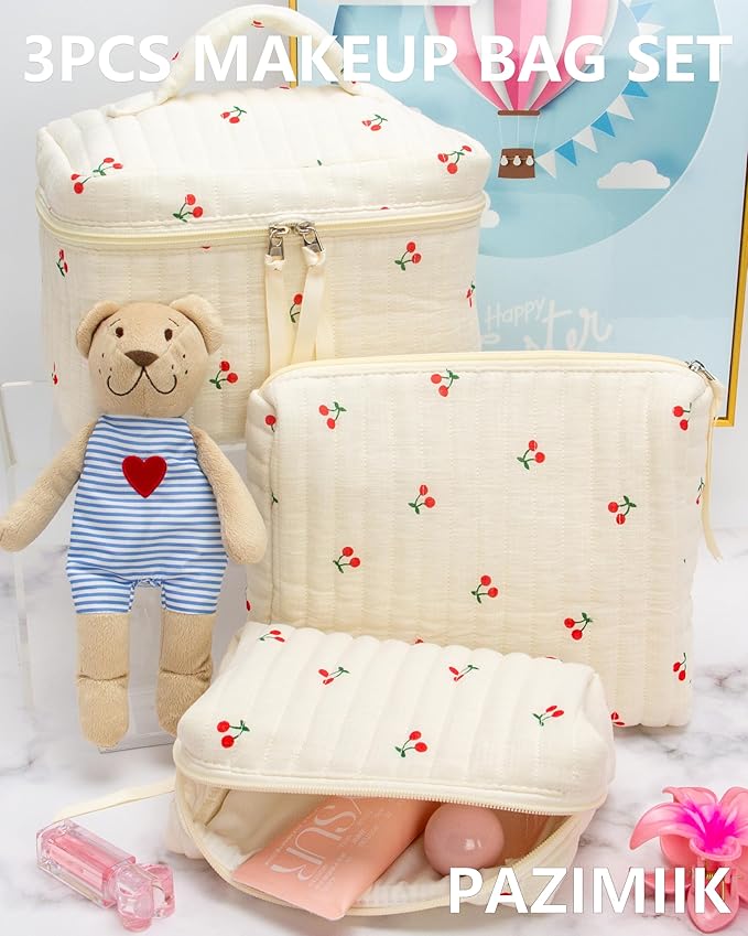 PAZIMIIK 3PCS Makeup Bag SET Large Travel Quilted Zipper Soft Cosmetic Case Pouch for Women Girls Make Up,Cherry Beige