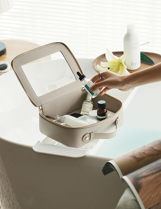 - [Spacious and Roomy] – The travel make up bag measures 9.6'' x 7.5'' x 3.1'' (24.5cm x 19cm x 8cm), ideal for extended trips or situations where you need to carry a comprehensive collection of makeup and skincare products. It is designed to fit comfortably in suitcases and big travel bags.