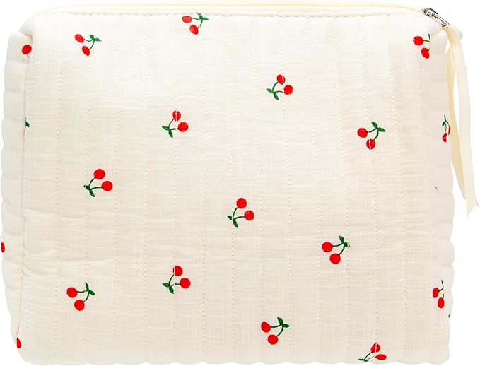 PAZIMIIK Quilted Makeup Bag Large Travel Zipper Soft Cosmetic Pouch for Women Girls Make Up,Cherry Beige