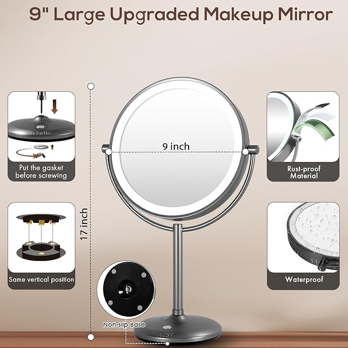 - 9-Inch Oversized Mirror & 16-Inch Ergonomic Height:Featuring 9-inch enlarged and 16-inch high mirror surface, lighted makeup mirror offers an expansive, clear view. It's ideal for creating a flawless look. Made of pearl nickel material, magnifying mirror is both elegant and durable. Pearl nickel metal frame with 72-layer electroplating, 8H hardness, anti-corrosion & fingerprint-resistant. Its anti-corrosion and dustproof properties ensure it stays in good condition over time and remains a reliable beauty tool