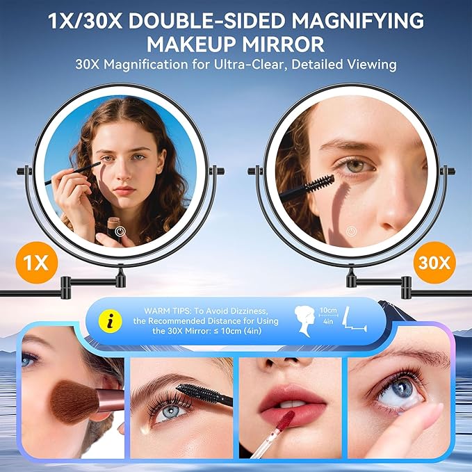 10'' 30X/1X Wall Mounted Lighted Makeup Mirror, 5000mAh Rechargeable Double-Sided Magnifying Mirror with Light, LED Vanity Mirror Touch Dimmable 3 Colors 360ยฐ Rotation Extended Foldable Arm, Black