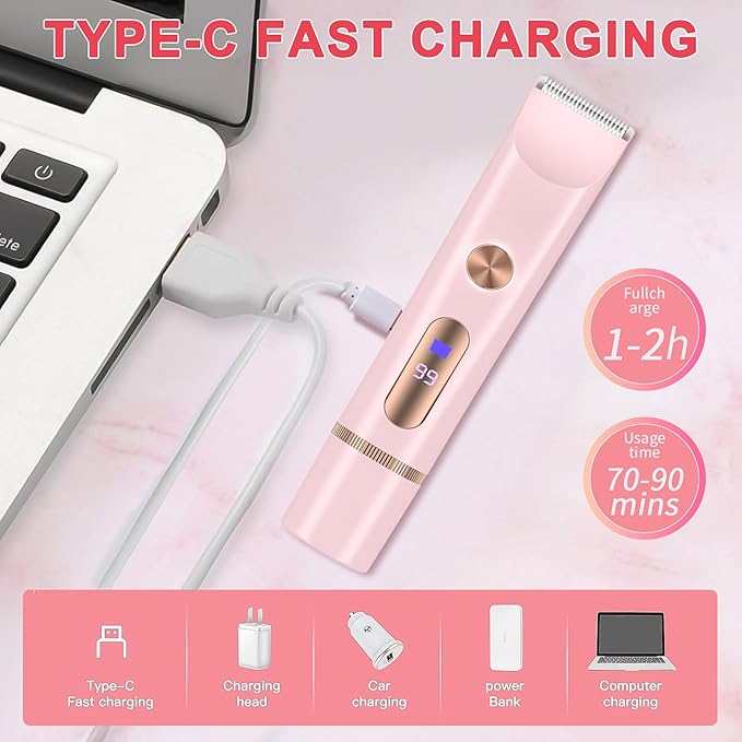- Rechargeable & Portable:The electric razors for women pubic hair with a USB cable, which is easily charged by multiple devices like power bank, computer, laptop and socket. Fast charging that delivers up to 90mins of power in just 1 hour. The LCD display on the bikini shaver for women pubic hair can clearly displays the shaver's remaining battery level. The electric bikini shaver for women is lightweight, ultra-portable body, suitable for travel.