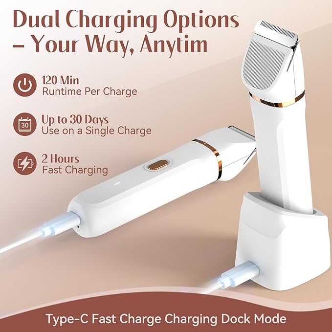 - β‘ USB-C Fast Charging & Convenient Dock: This electric razor for women features a modern USB-C fast charging system and a convenient charging dock. A full 2-hour charge delivers up to 90 minutes of continuous use, making it perfect for home grooming or travel touch-ups. Forget battery hassles β stay ready anywhere.
