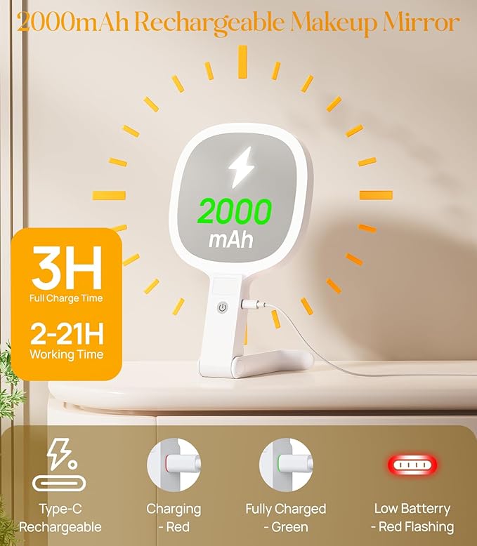 - 【Auto-Off & Brightness Memory】This handheld mirror combines 30-min auto-off during inactivity to prevent battery drain. Brightness memory instantly recalls your last vanity mirror setting – no reset needed, like a personalized salon mirror