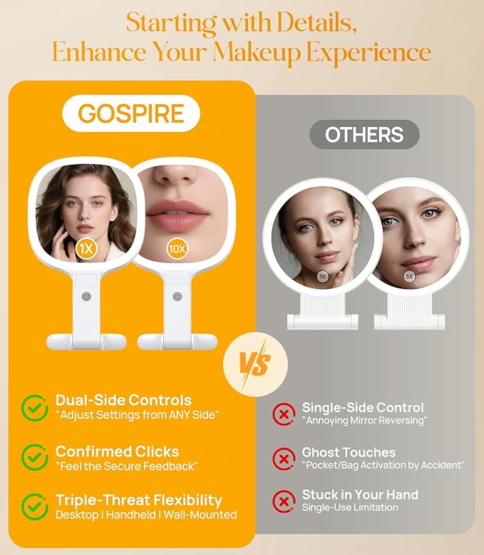 Gospire 6.8" Travel Vanity Mirror, 3-in-1 Hanging/Handheld/Desktop Use with Dual-Side Buttons, 1X/10X Magnification, 3-Color Dimmable LED, Auto Memory + Velvet Pouch (White)