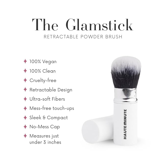 - Vegan & Clean: Experience guilt-free beauty with our Haute Minute Makeup Glamstick Retractable Brush, made from 100% vegan and cruelty-free materials. This high-quality brush features soft synthetic bristles, perfect for applying powder makeup brushes, including a powder brush for pressed powder and a loose powder brush for a flawless finish.