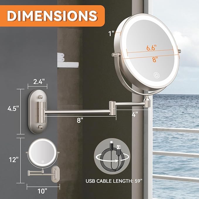 1X/30X Wall Mounted Lighted Makeup Mirror, 8" 3200 mAh Rechargeable Double-Sided Magnifying Mirror, Touch Dimmable 3 Color Lights, 360ยฐ Rotating Foldable 14.5" Extension Arm, Brushed Nickel