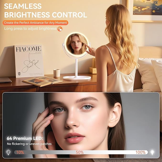 - ๐ฏ ๐๐ผ๐น๐ผ๐ฟ ๐๐ถ๐ด๐ต๐๐ถ๐ป๐ด & ๐๐ถ๐บ๐บ๐ฎ๐ฏ๐น๐ฒ ๐๐ฟ๐ถ๐ด๐ต๐๐ป๐ฒ๐๐: This makeup mirror features a total of 64 LED lights, offering 3 adjustable color temperatures: cool, natural, and warm light. Unlike other mirrors with only one switch, our innovative design features independent switches on both sidesโno more awkward reaching or flipping. Simply press the buttons to customize brightness levels and select your ideal color for any skincare or makeup needs.