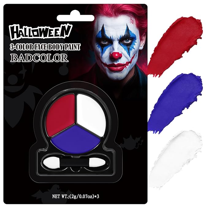 - 【Red White Blue Face Paint Kit for Halloween, Patriotic Events】This face body paint set create Halloween looks like creepy Joker clowns, Harley Quinn–inspired makeup, patriotic zombies, American flag face designs, broken porcelain dolls, and icy snow queens with this oil-based face painting trio. Ideal for cosplay, costume parties, SFX makeup, sports eye black, and festive occasions like Independence Day and Memorial Day. Includes a dual sponge tip for easy, mess-free application—perfect for beginners or quick Halloween touch-ups.