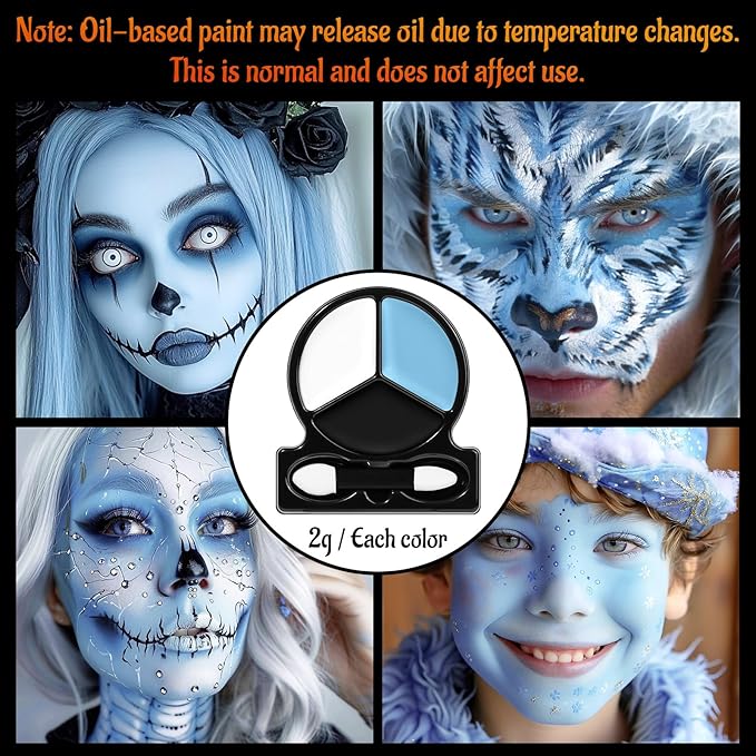 - 【Black White Light Blue – Ice Queen, Sally Maekup 】– This oil-based facepaint kit lets you recreate iconic looks like Corpse Bride, Sally Face, Ice Demon, and Blue Heart makeup. Whether you're going for a frosty skeleton, Ice Witch, Alien or even Mermaid, this face paint trio offers endless creative possibilities. Also works great as eyeblack under the eyes for baseball, softball, football, lacrosse, and team spirit or school event face painting. Includes a dual sponge tip for easy, mess-free application—perfect for beginners or quick Halloween touch-ups.