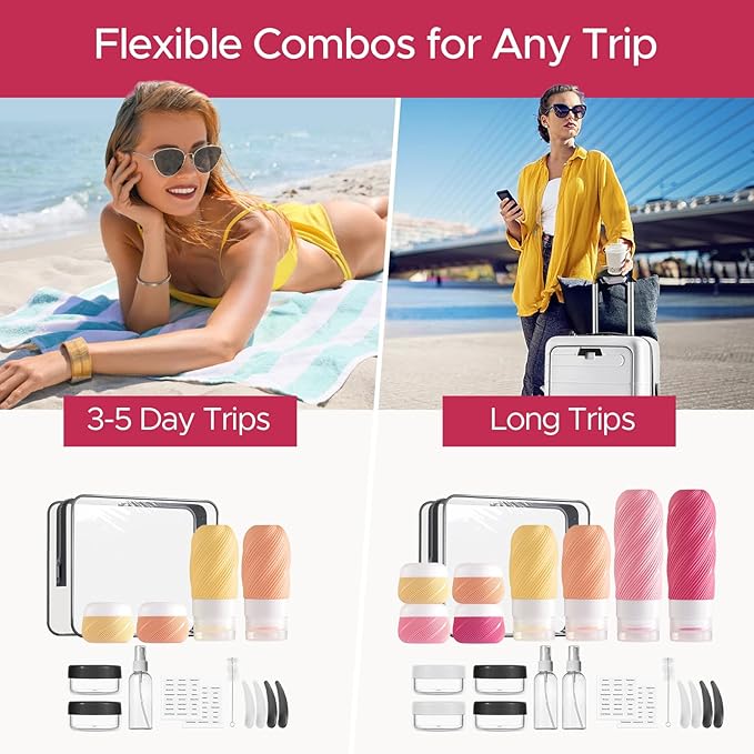 - Flexible Combos for Any Trip: Designed for both short getaways and long-haul adventures—no more carrying bulky full-size bottles. LitBear 23 pack travel bottles set includes 4 silicone travel bottles (3oz & 2oz), 4 travel containers for creams (1oz), 4 plastic jars (0.34oz), 2 fine mist spray bottles (1oz), 1 funnel, 1 brush, 4 spatulas, 2 labels, and 1 TSA approved travel bottles clear bag