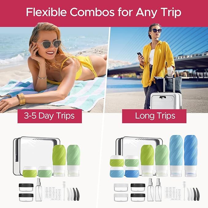 - Flexible Combos for Any Trip: Designed for both short getaways and long-haul adventures—no more carrying bulky full-size bottles. LitBear 23 pack travel bottles set includes 4 silicone travel bottles (3oz & 2oz), 4 travel containers for creams (1oz), 4 plastic jars (0.34oz), 2 fine mist spray bottles (1oz), 1 funnel, 1 brush, 4 spatulas, 2 labels, and 1 TSA approved travel bottles clear bag
