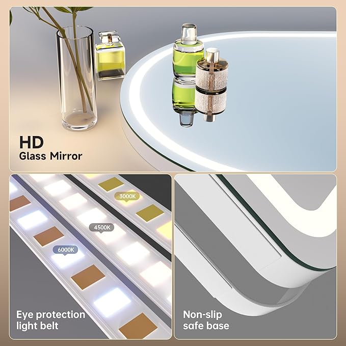 - Custom Lighting Vanity Mirror at Your Fingertips: Dual-control brilliance: Adjust brightness (0%-100%) and switch between warm/natural/cool white light (Max 6000 Lumens). Replicate any lighting scenario from morning skincare to evening glam