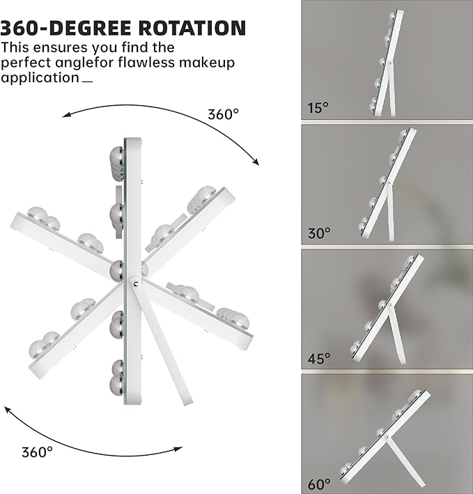 - 360° Rotation and Elegant Frame:The vanity mirror with lights features smooth 360° rotation for shadow-free angles. Its rounded-corner rectangle frame adds modern sophistication - soft edges enhance safety while matte finish elevates your vanity space