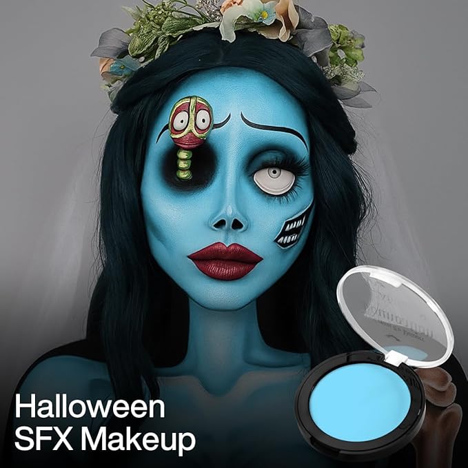 Light Blue Face Body Paint Cream to Powder Foundation Makeup, Professional Blue Cream Face Painting for Kids & Adults, Greasepaint for Halloween FX, Theater, Sally Makeup, Corpse Bride, Smurf, Cosplay