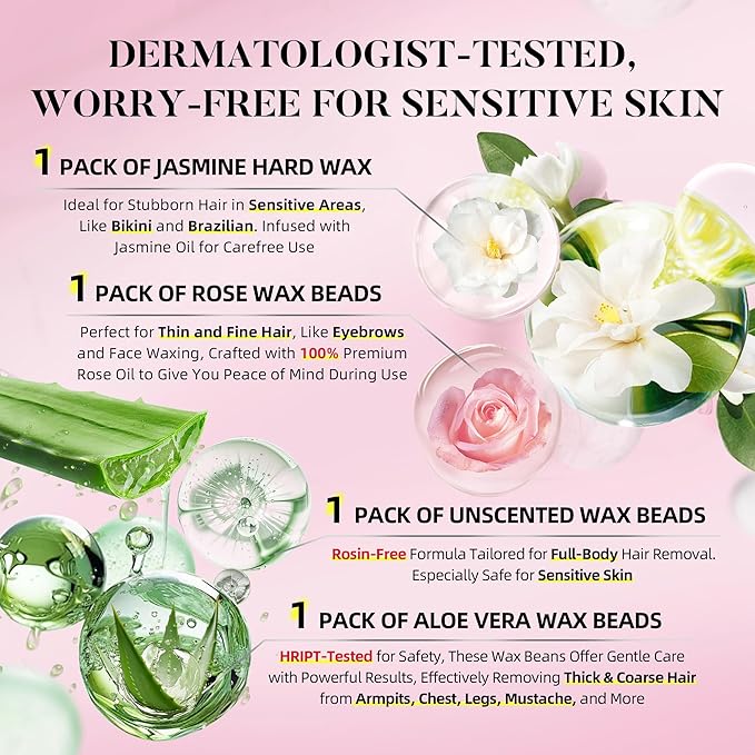 - 【Effortless Cleanup & Skin-Friendly Formula】Simplify your waxing routine with the wax machine's innovative silicone waxing pot; the non-stick wax pot allows easy wax removal for quick cleanup, making the hard wax kit reusable and mess-free; this wax kit is dermatologically tested to remove fine, coarse and curly hair without irritation, leaving skin smooth and radiant as a gentle wax kit for hair removal