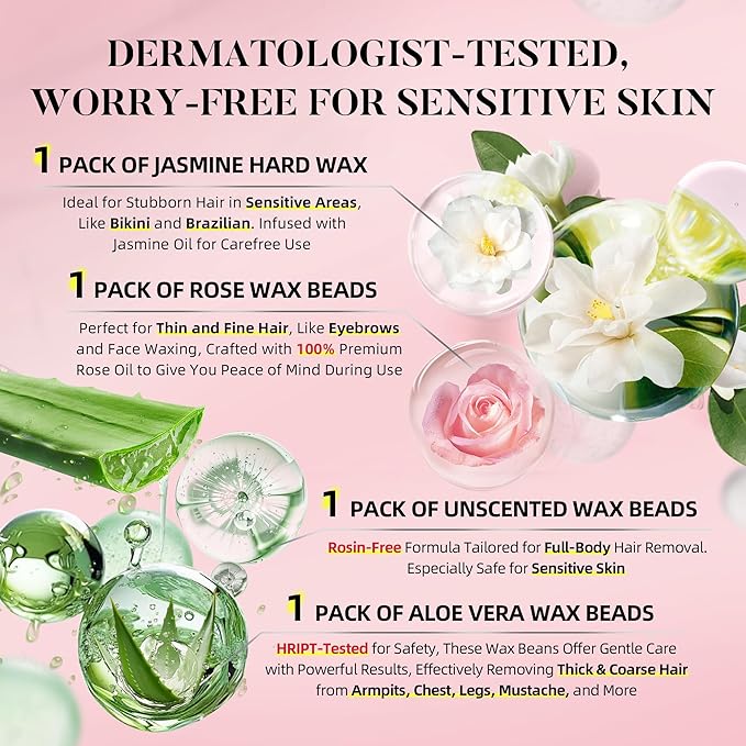 - 【Effortless Cleanup & Skin-Friendly Formula】Simplify your waxing routine with the wax machine's innovative silicone waxing pot; the non-stick wax pot allows easy wax removal for quick cleanup, making the hard wax kit reusable and mess-free; this wax kit is dermatologically tested to remove fine, coarse and curly hair without irritation, leaving skin smooth and radiant as a gentle wax kit for hair removal