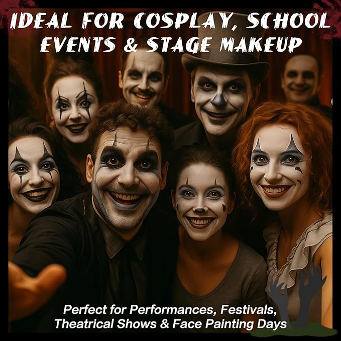 - 【Great for Halloween & Special Occasions】 Perfect for Halloween, cosplay, or stage effects, this paint stick lets you create popular looks including Clown, Skeleton, Skull, Corpse Bride, Vampire, Zombie, Witch, Sally Face, Goth, Avatar, Mermaid, Spiderweb, Hulk, Monster, and more. Ideal for SFX makeup, theatrical performances, birthdays, and costume parties.