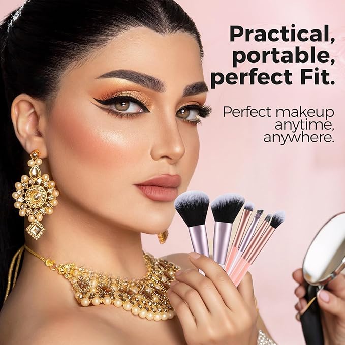Travel Makeup Brush Set – Portable 6PCS Mini Cosmetic Brushes for Foundation, Concealer, Eyeshadow, Blush, Powder, Contour & Highlight, On-the-Go Makeup Brush Kit with Travel Case
