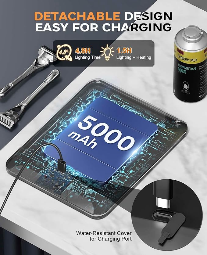 - Long-Lasting Rechargeable Battery - Gefaxi LED lighted shaving mirror is equipped with a 5000mAh battery, delivering week of power on a single charge (based on daily use). The clever detachable design is convenient to charge (1. remove the mirror by lifting it up, 2. put it on the table, 3. open the water-resistant cover, 4. charge with the included USB-Type C cable).
