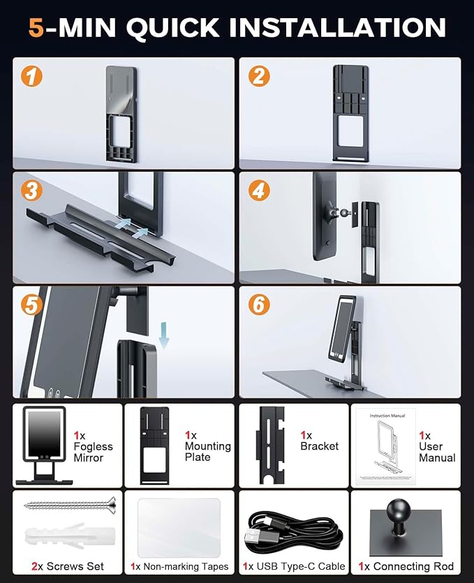 - Easy, No-Drill Installation - Just peel-and-stick the strong adhesive bracket onto your wall and you're set. If you prefer extra security, the kit includes screws. The simple instructions let you mount the bathroom fog free shower mirror in minutes, even in a rental or tight shower space.